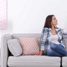 Eine Junge Frau sitzt in einem Raum auf der Couch mit der Fernbedienung für die Klimaanlage die an der Wand über Ihr ist. Aus der Klimaanlage kommt kühle Luft, und die Frau atmet Tief und lächelt.