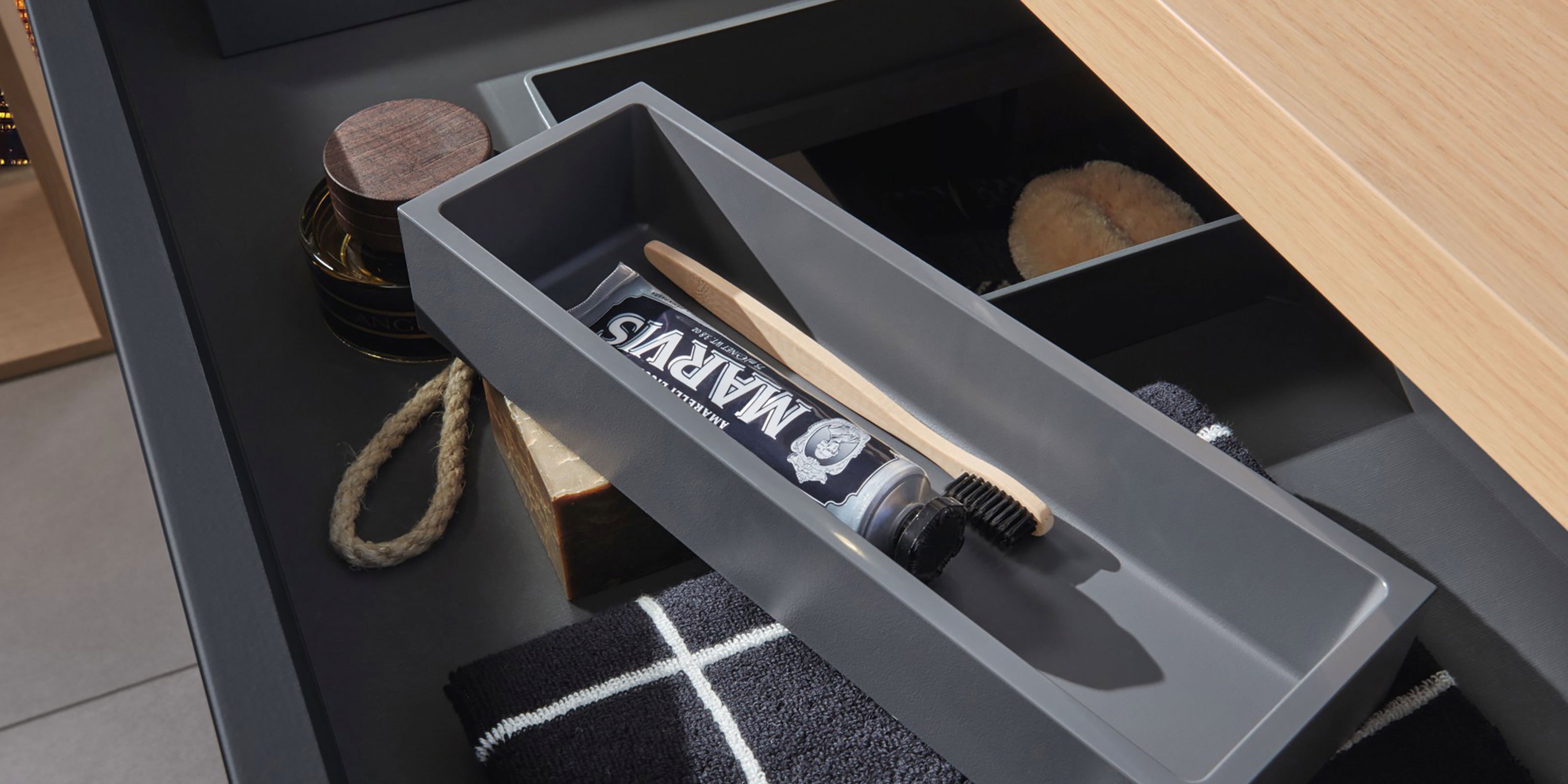 Der symmetrische Doppelwaschplatz mit vier Auszügen und offenem, breitenvariablen Regal bietet spielend Platz für zwei. Seine pflegeleichte, schwarz matte Oberfläche mit Anti-Fingerprint-Effekt steht in gekonntem Kontrast zum hellen Holzton der 2morrow Platte Slim. Einen edlen Touch verleihen die Griffe in Gold Matt mit dazu passenden Wandarmaturen. Die beiden auffälligen, runden Reflection Lichtspiegel LOLA sorgen für stimmungsvolles Licht, das per Raumschaltung bedient wird.